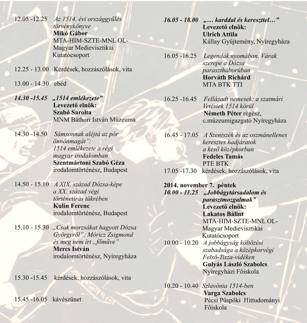 2014. november 6-án és 7-én Nyíregyházán a Jósa András Múzeum ad otthont annak a konferenciának, amelyen a korszak legkiválóbb kutatói tartanak előadást. A két nap alatt 16 előadás hangzik el a MTA BTK Történettudományi Intézete, a Magyar Medievisztikai Kutatócsoport (a MTA – Hadtörténeti Intézet és Múzeum – Szegedi Tudomány Egyetem – MNL Országos Levéltár), a Pécsi Tudományegyetem, a Pécsi Püspöki Hittudományi Főiskola, a Nyíregyházi Főiskola kutatóinak részvételével. Az előadások foglalkoznak a parasztháború lehetséges gazdasági okaival, az oszmán ellenes keresztes hadjáratokkal, az 1514. évi törvénykezéssel. Arról is szó esik milyen szerepe volt a váraknak a parasztháborúban, Dózsa és Ecsedi Báthori István temesi ispán seregeinek első találkozásáról, miért lázadtak fel a nemesek és csatlakoztak Dózsa seregéhez, hogyan ítélik meg külföldön a parasztháborút, hogyan jelenik meg a régi magyar irodalomban 1514, ill. hogyan alakul Dózsa megítélése a különböző korszakokban és még sok érdekességet tudhatunk meg erről a korról.