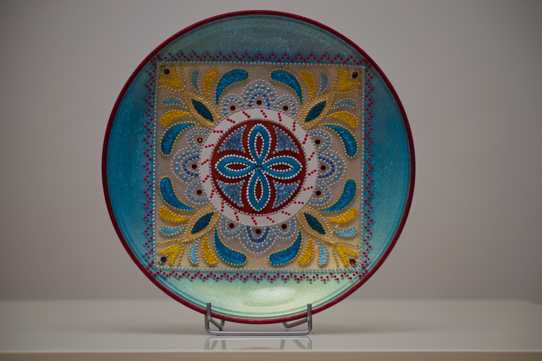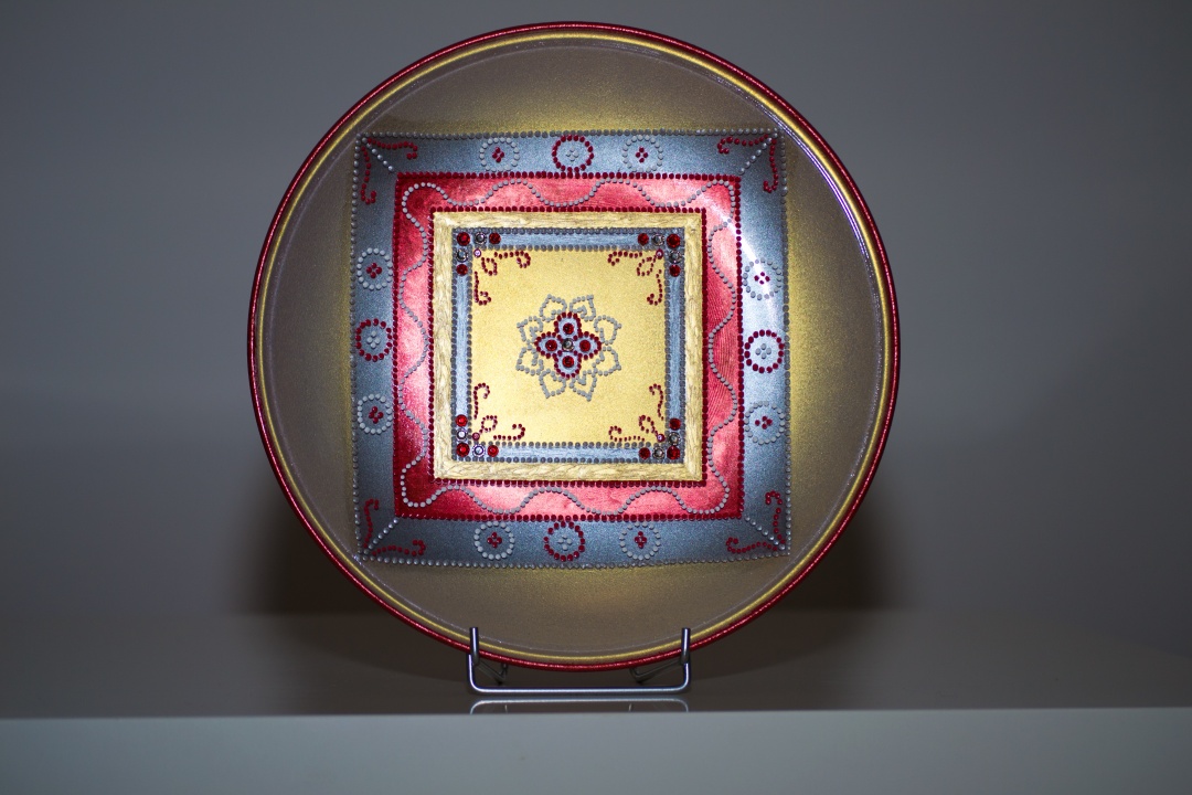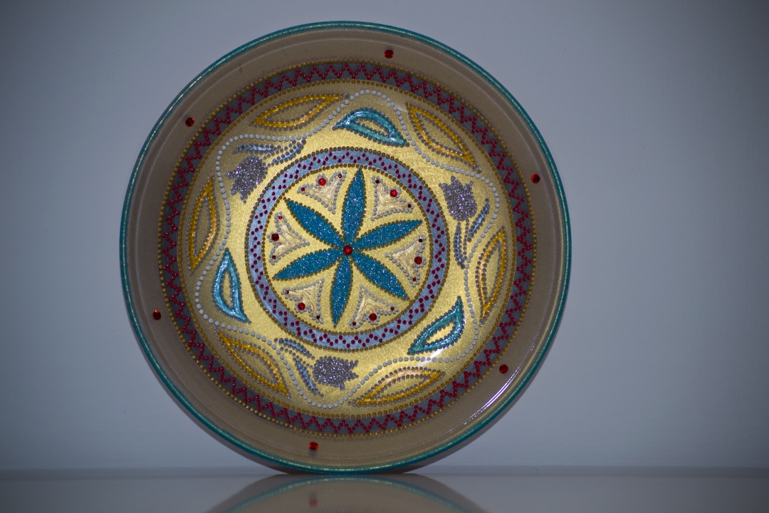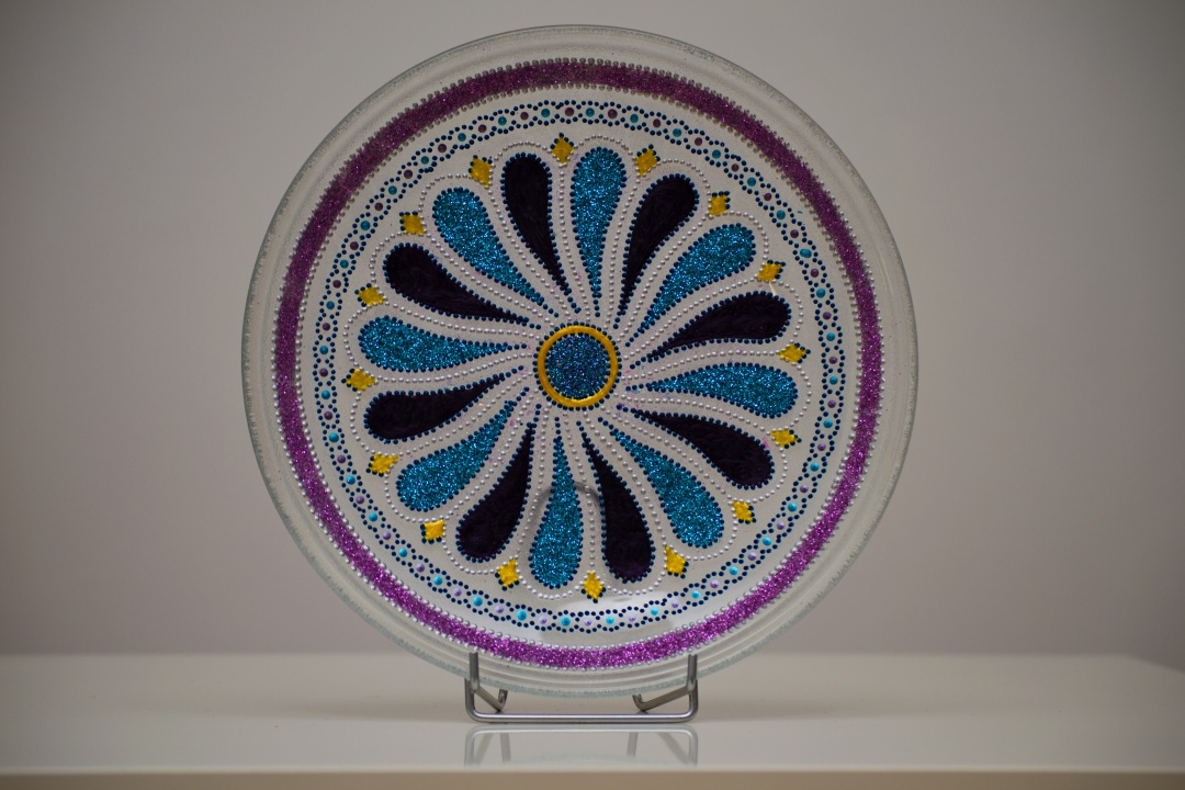 Üveg tálakra festettem különféle szimbólumokat, formákat, így születtek a képeken látható energetizáló mandalák.