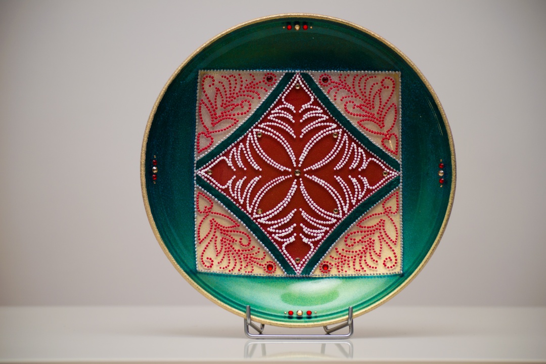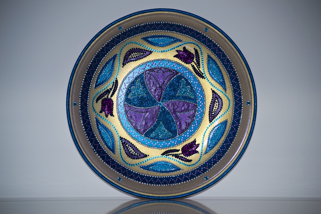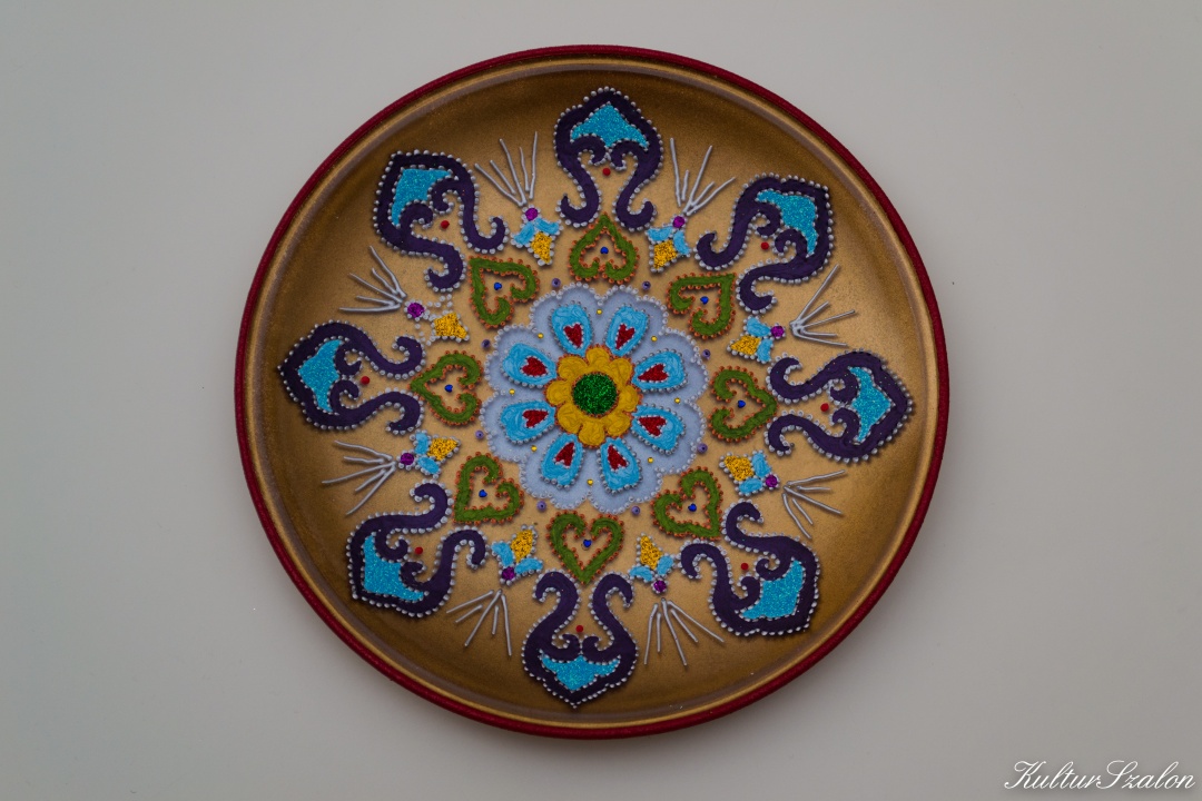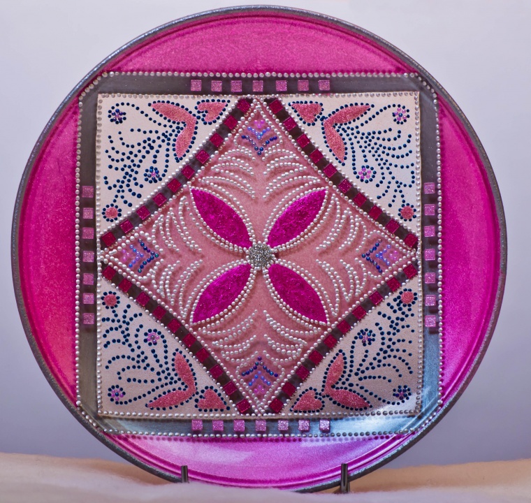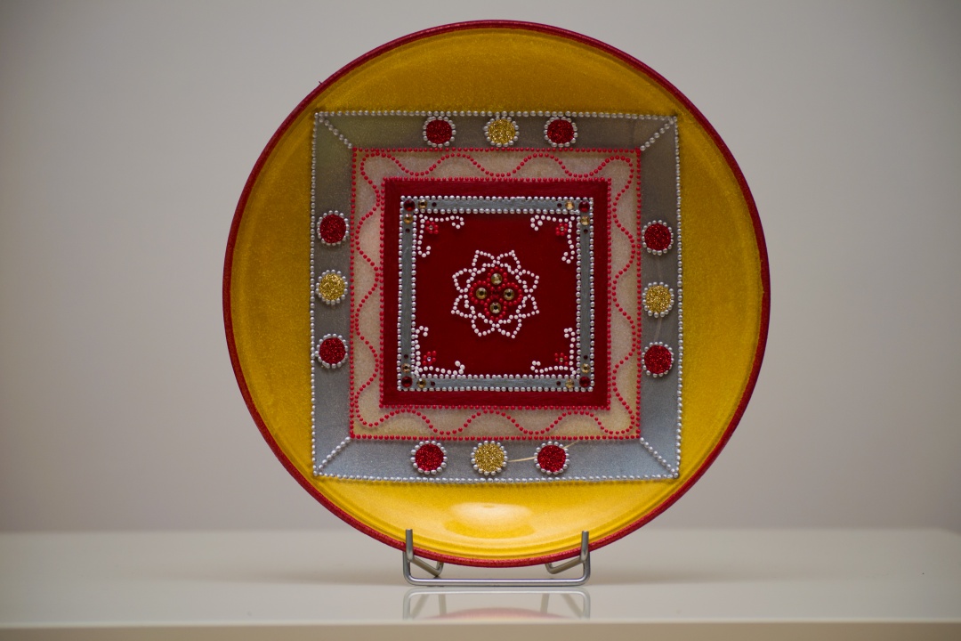 Üveg tálakra festettem különféle szimbólumokat, formákat, így születtek a képeken látható energetizáló mandalák.