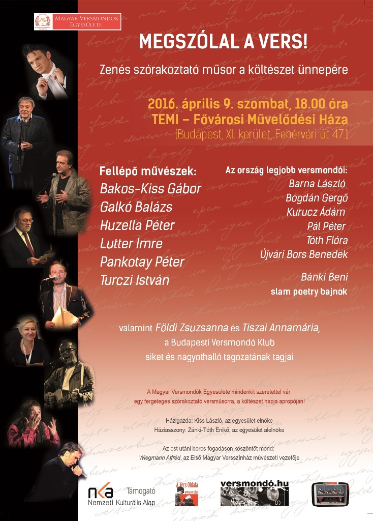 Versmondók és slammerek, valamint Bakos-Kiss Gábor, Galkó Balázs, Huzella Péter, Kiss László, Lutter Imre, Pankotay Péter, Turczi István, illetve az ország legjobb versmondóinak közreműködésével invitálja a közönséget a Magyar Versmondók Egyesülete április 9-én szombaton, 18:00 órára a TEMI Fővárosi Művelődési Házába, egy fergeteges szórakoztató műsorra, a költészet napja apropóján!