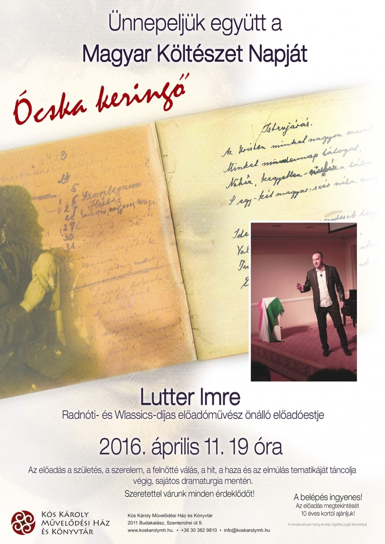 Két nappal később, április 11-én hétfőn 19:00 órától Lutter Imre Wlassics- és Radnóti-díjas előadóművész Ócska keringő című önálló estjével ünnepli a költészet napját a Kós Károly Művelődési Ház és Könyvtár. Budakalász mellett a fővárosi nézők és a környező településeken élők érdeklődésére is számítanak a szervezők.