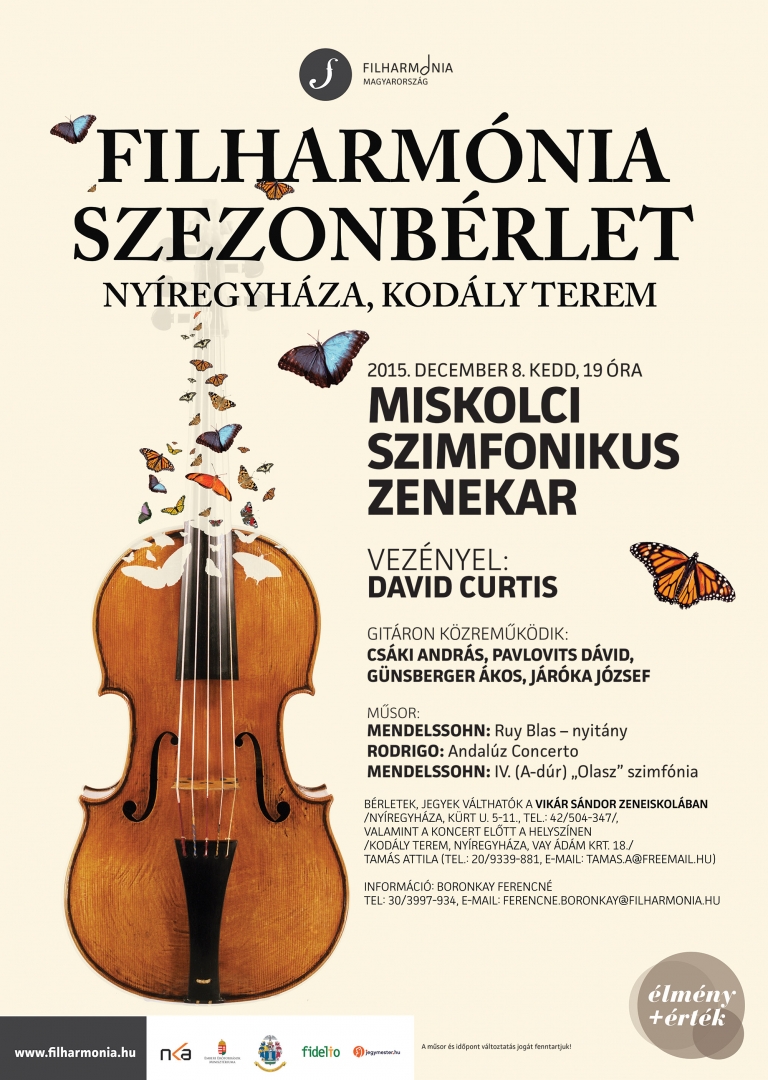 A Filharmónia Magyarország programjainak keretében a Miskolci Szimfonikus Zenekar ad koncertet december 8-án Nyíregyházán, a Kodály Zoltán Általános Iskola, Kodály termében. Minden érdeklődőt szeretettel várnak.