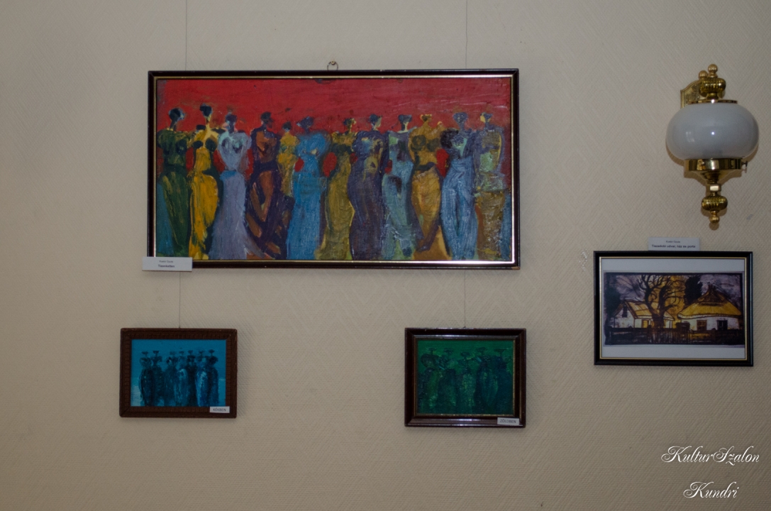 Kustor Gyula: Főleg a természetből merítek ötletet. Gyermekkoromban, öt-hat éves koromig tanyán éltem, és annyira belém ivódott a tanyasi környezet. Ebből indultam ki. Itt a kiállításon is van egy pár ilyen alkotás, például Tiszadobról egy nagyon szép parasztház. A főiskolai dolgozatom témája az absztakciósan absztrahálás egy témára volt. Két fotóból indultam ki, az egyiken állnak egymás mellett, az emberek, ráadásul Farkas Bertalan is köztük van, a másikon egy esküvői szabadtéri tánc volt, kint az udvaron. Ebből indultam ki. Az egyiken a statika, a másikon a dinamika, ebből született meg a szakdolgozatom.
